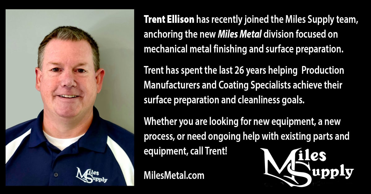 Trent Ellison has recently joined the Miles Supply team as director of the new Miles Metal division, focused on mechanical metal finishing and surface preparation. Trent has spent the last 26 years helping production manufacturers and coating specialists achieve their surface preparation and cleanliness goals. Whether you are looking for new equipment, a new process, or need ongoing help with existing parts and equipment, call Trent!